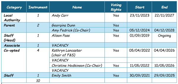 The governing body are made up of a group of volunteers who all have an interest in our school and includes parents, staff members, and representatives of the community and the local authority.The skills and experience are diverse but we share the same aims – to challenge, support and value the school in whatever way we can.