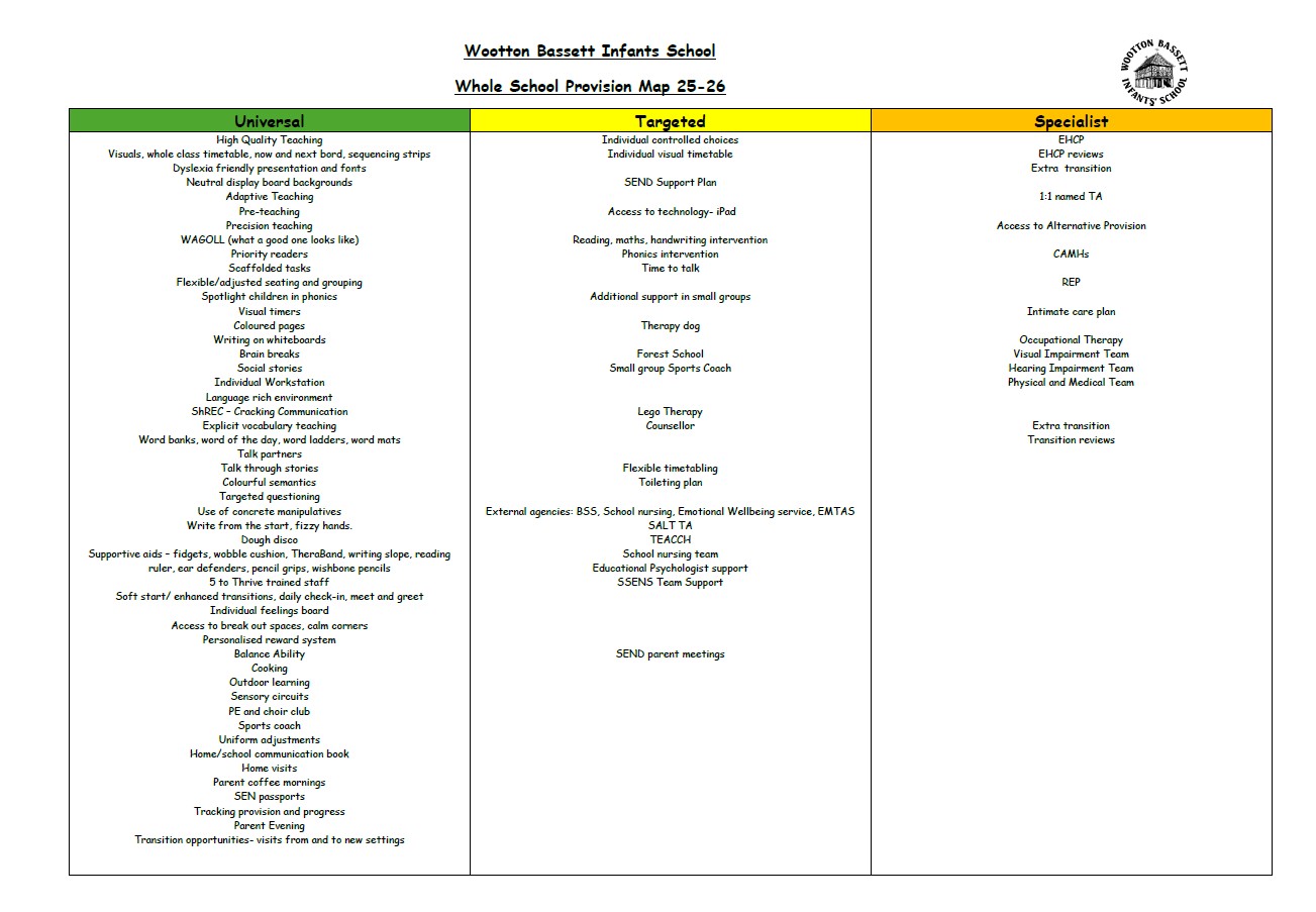 Wootton Bassett Infants' is committed to the learning and development of all of its pupils and encourages them to participate and achieve in every aspect of school life. We aim for equal opportunities for all members of our school community and are committed to being a full inclusive school.